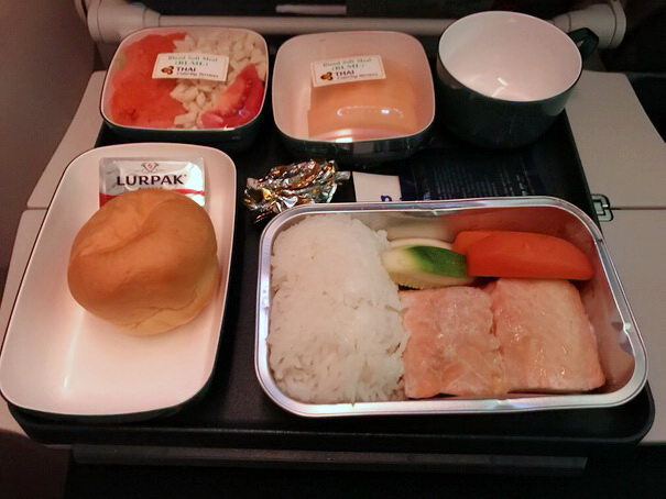 Then the flight attendants came around with drinks and a hot meal service. I had pre-ordered a bland meal (BLML) in advance, as my stomach doesn’t handle heavy or spicy food very well. For dinner, I was served baked salmon with plain rice, accompanied by a side salad and steamed carrots with boiled chicken. Despite being quite plain, the food was surprisingly tasty.