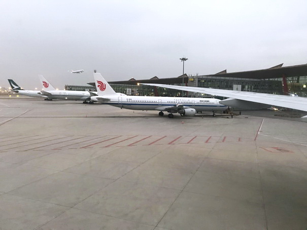 After the meal, it was time to rest, as this four and a half hour flight was a red-eye flight. I had to force myself to try to sleep so that I would be alert when we landed at Beijing International Airport. I managed to get a couple hours of sleep, but then the flight attendant woke me up to adjust my seat and fasten my seatbelt for landing. Beijing International Airport is a hub for Air China, so it was no surprise that the airport was bustling with Air China planes everywhere.