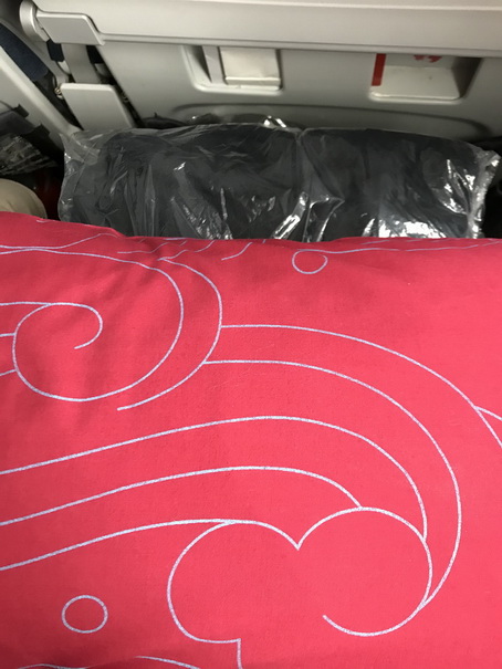 This aircraft had Economy class seating arranged in a 3-3-3 configuration, like most other airlines. There were amenities such as PTVs, pillows, blankets, headphones, and USB charging ports. The seat width was just right for me to lean back and sleep comfortably (though sitting for a long time did make me a little sore).