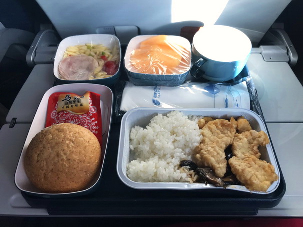 After that, the captain pushed back and we took off on time. About an hour into the flight, the flight attendants served the first hot meal. For the first meal service, there were two options: Fried Rice with Chicken or White Rice with Fish. I opted for the fish and it tasted like Chinese-style fried fish with soy sauce. It was delicious.