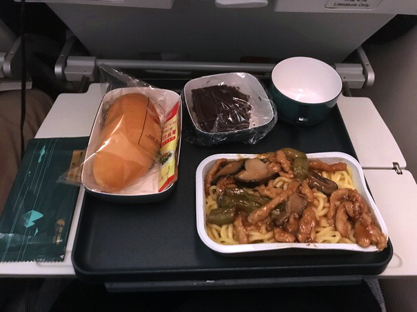 3 hours before the scheduled landing time, the staff served the second meal. There were two options: Rice with seafood or Pork Noodle. I chose the Pork Noodle.