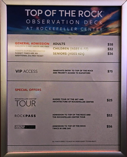 I arrived at Rockefeller Center around 3.30 pm and didn’t hesitate to ask the receptionist where I could buy tickets and how to get to Top of the Rock. She kindly pointed me to the direction of a large entrance sign located on the side of the building. Since I hadn’t purchased tickets online, I headed over to the ticket counter and was lucky enough to find a short line. The ticket price for the observation deck was $38.