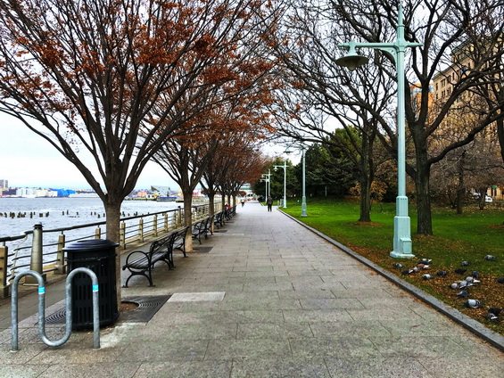 I spent my morning strolling along the streets of Greenwich Village, enjoying the peaceful atmosphere. The houses in this neighborhood looked beautiful and had a distinct American charm, almost like in the movies. I must say, this area was very pleasant to be in, but the prices were also exorbitant. Only the wealthy could afford to live here. I continued walking until I found myself at the edge of the Hudson River. There was a small public park along the riverbank, with bike and jogging paths as well. The view of the Hudson River from this side of Manhattan was breathtaking, and there was nothing obstructing the view. It was possible to see the full skyline of New Jersey from here.