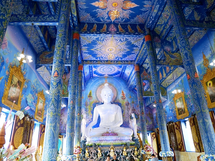 If the hallmark of Wat Rong Khun is “white color” throughout the temple, the hallmark of Wat Rong Seur Ten is “blue color”. The Blue Temple was designed and developed by Ajarn Phutthaa Kabkaew, a local artist from Chiang Rai and a student of Ajarn Chalermchai. The architecture of this temple focuses on the story of Buddhism similar to the White Temple, but the color tone used in the design emphasizes blue color. In my opinion, this gives a strong and cool feeling.