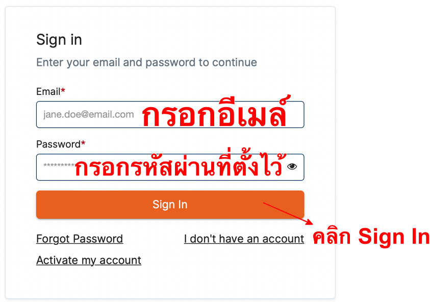 - เมื่อคลิกแล้วระบบจะพาไปที่หน้า Login ให้เราเข้าระบบโดยการ Login ด้วยอีเมล์และรหัสผ่านที่เราตั้งไว้ตอนแรก