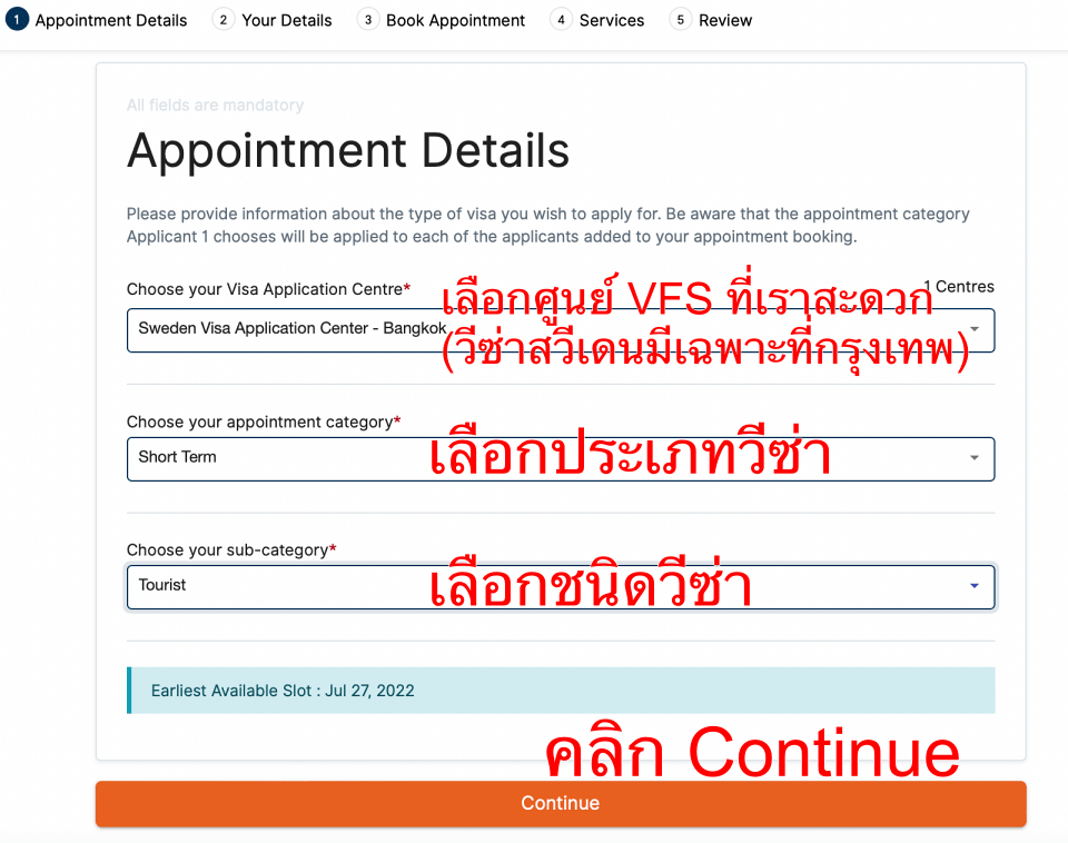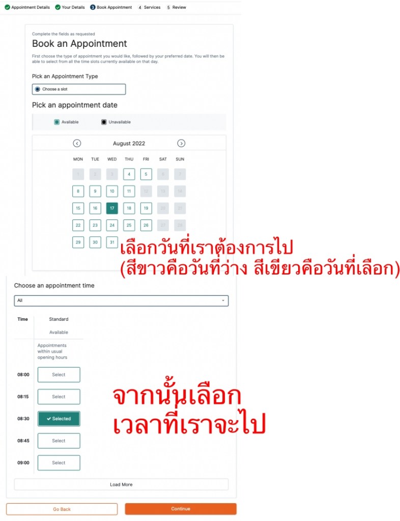 - ต่อมาก็เลือกวันและเวลาที่เราต้องการไปยื่นเอกสารที่ VFS