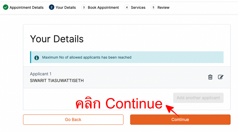 - ตรวจสอบข้อมูล หากต้องการเพิ่มผู้สมัครที่จะยื่นในคราวเดียวกัน เพิ่มได้ที่นั้นตอนนี้ เรียบร้อยแล้วกด Continue