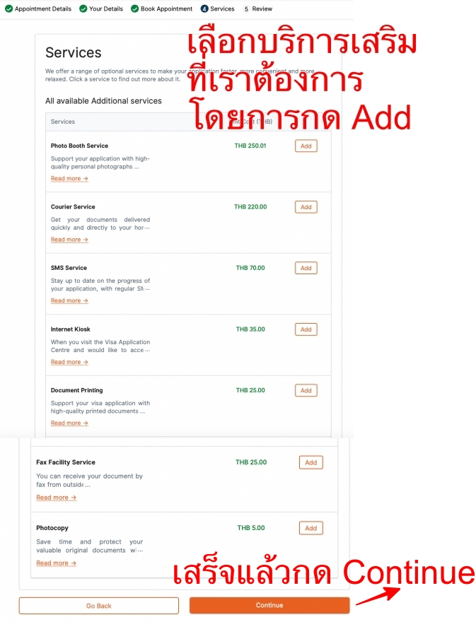- จากนั้นก็เลือกบริการเสริมที่เราต้องการ (ตัวอย่างกรณีผมเลือกบริการ Courrier Service ที่ให้ทาง VFS ส่งเล่มพาสปอร์ตคืนให้ทาง EMS เลยจะได้ไม่ต้องเสียเวลาไปรับอีกรอบ และผมก็เลือกบริการ SMS Service ให้ส่งความคืบหน้ามาทาง SMS เรา) ราคาก็ตามที่เเสดงในหน้าจอเลย การจ่ายเงินก็ไปจ่ายวันที่เรายื่นเอกสาร