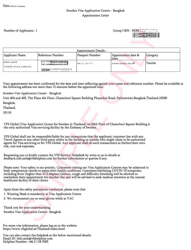 - หากมีข้อสงสัยสามารถสอบถามทาง VFS ได้โดยตรง ตามข้อมูลการติดต่อจากเว็บไซต์ของ VFS (https://visa.vfsglobal.com/tha/en/swe/contact-us)
