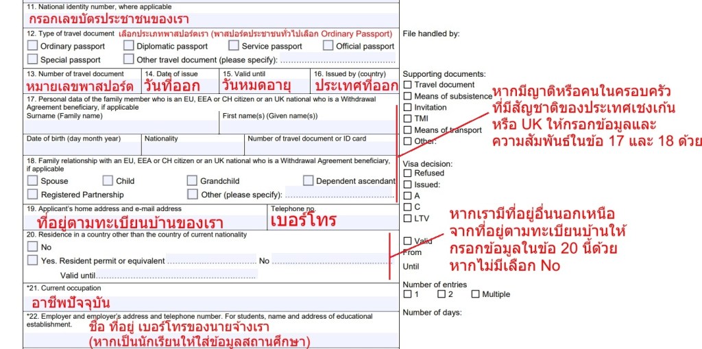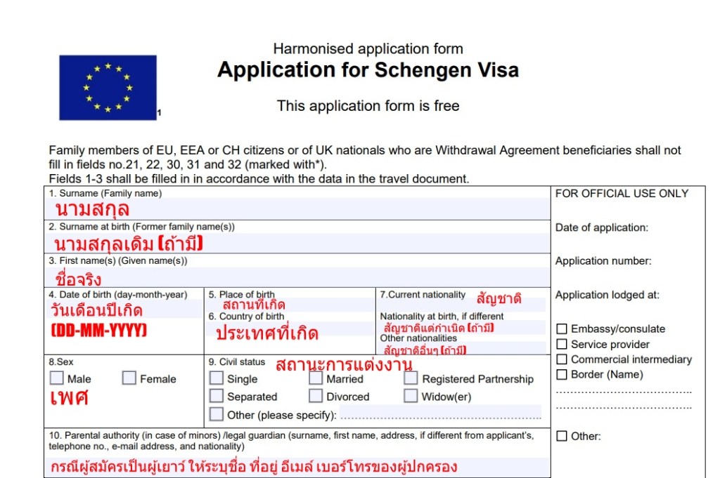 - แบบฟอร์มขอวีซ่าเชงเก้น (ดาวน์โหลดจากที่นี่) กรอกข้อมูลให้เรียบร้อยเป็นภาษาอังกฤษ โดยข้อมูลทั้งหมดต้องตรงกับเอกสารการเดินทางของเรา (สามารถทำได้ทั้งพิมพ์ในไฟล์โดยตรงหรือเขียนด้วยปากกา)