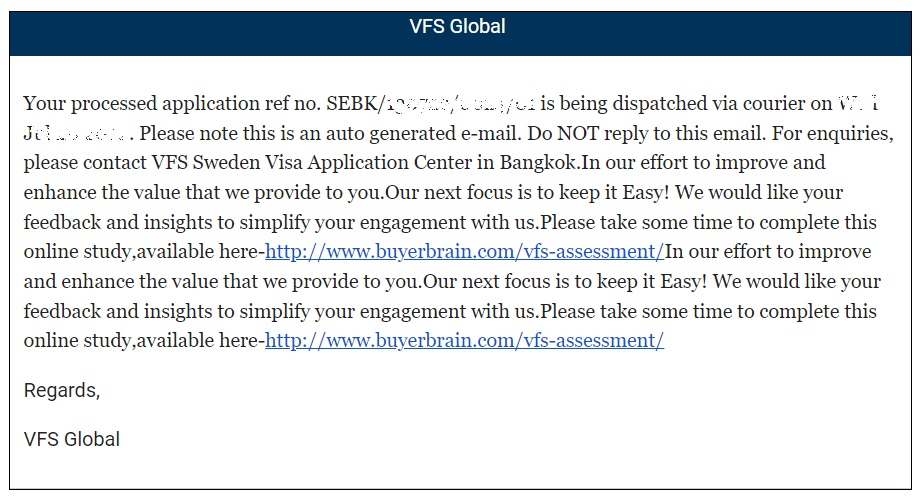 และแนะนำให้เช็คอีเมล์เป็นครั้งคราวเพราะสถานะต่างๆ จะส่งทางอีเมล์เป็นหลัก กรณีการสมัครของผมนั้นใช้เวลาประมาณ 6 วันนับจากวันยื่นเอกสารที่ VFS ก็ได้รับอีเมล์ว่าทาง VFS ได้รับเล่มพาสปอร์ตคืนมาจากสถานทูตสวีเดนแล้ว และกำลังนำส่งคืนให้เราทางไปรษณีย์ หากใครสมัคร SMS Service ด้วยก็จะได้รับ SMS แจ้งเตือนด้วยเช่นกัน ส่วนตัวคิดว่าบริการนี้อาจจะไม่จำเป็นต้องใช้ก็ได้ เพราะยังไงก็ได้รับอีเมล์เหมือนกัน 😛