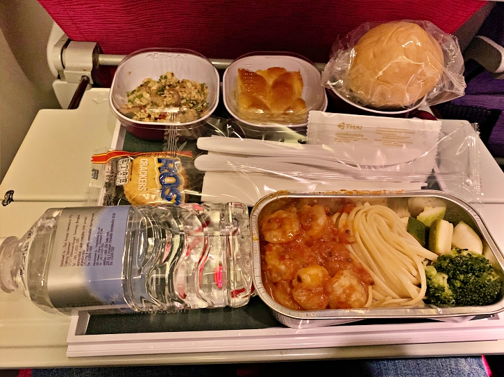 After the boarding complete, the flight was pushed-back and taken off 15 minutes behind the schedule due to some catering problem. But it was not the big deal. Then, 30 minutes after taking-off, the cabin crews have served the hot meal. For economy class, it has 2 choices, Rice with chicken curry or Spaghetti with shrimp. I selected the second one. 🙂 The free-float drink and alcoholic beverage were served during the meal too.