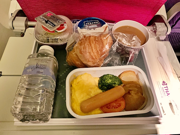 2 hours before arrival time, the breakfast was served. it had only one choice for Economy class, Omelet with chicken sausage. Hot tea and coffee were served during the meal too.