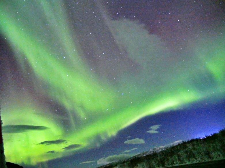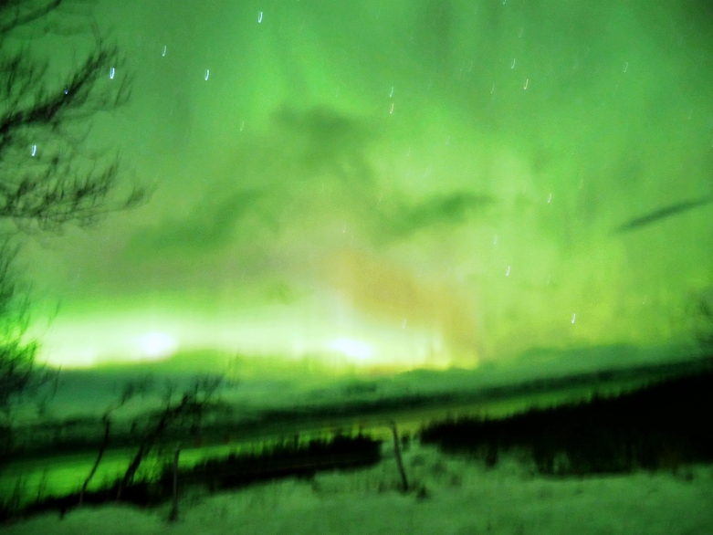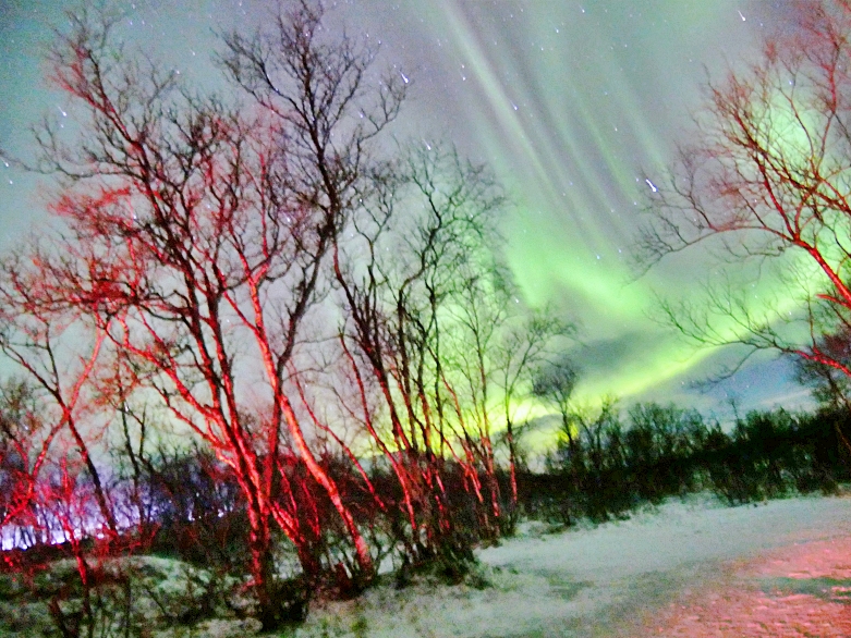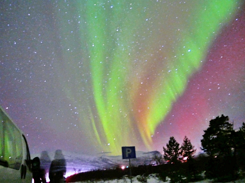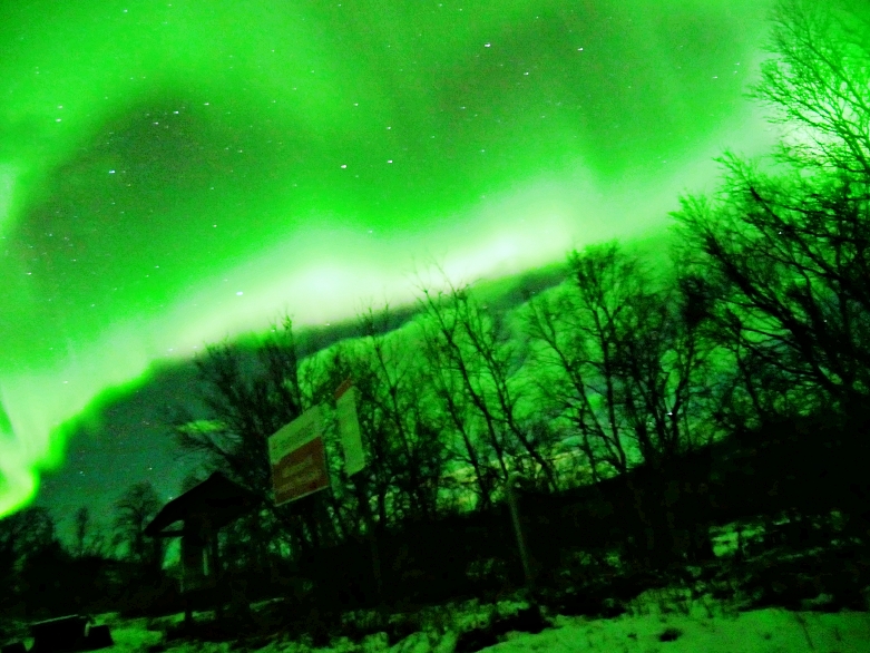 After we visited Kiruna church, we back to the hotel to take some rest. Actually, as we mentioned in previous chapter, we should spare at least 3 nights above the arctic circle in order to make sure we can see the northern light. Tonight, we stayed at Kiruna which is one of the biggest city in Swedish lapland. We had the appointment on 7PM with Kiruna Guidetur. We booked the northern light hunting with this company in advance. And, we were lucky again. Even it had slightly snow in Kiruna on that night, but, when we drove out from the city about 30 minutes, we saw the stars and clear sky. The northern lights were bold, thick and bright nearby Kiruna at that night 😛