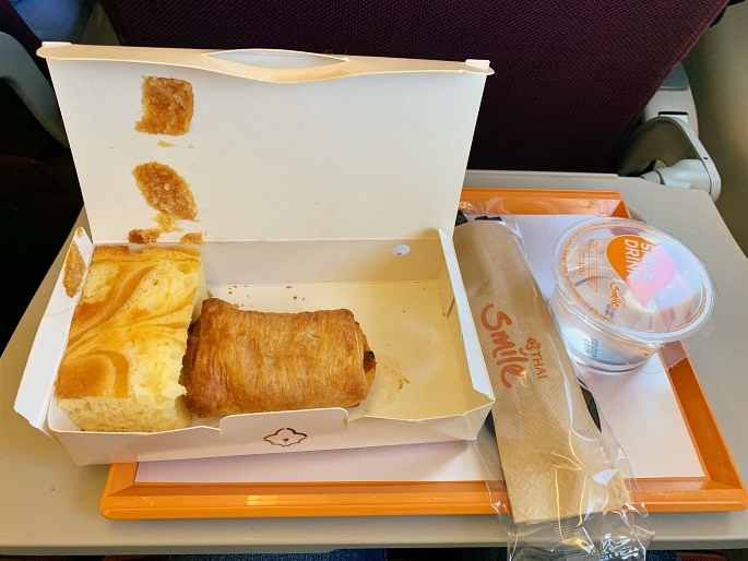 The flight was pushed back and taken-off on-time. When the seatbelt sign has been switched off, the crew had served us the snack. It had only one choice as it is only short-haul flight. At that date, the menu was chicken pizza pie and butter cake served with hot tea or coffee.