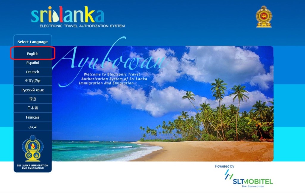 1. เข้าไปที่เว็บไซต์ https://eta.gov.lk/slvisa จะพบหน้าจอเหมือนด้านล่าง จากนั้นกดเลือกภาษา English