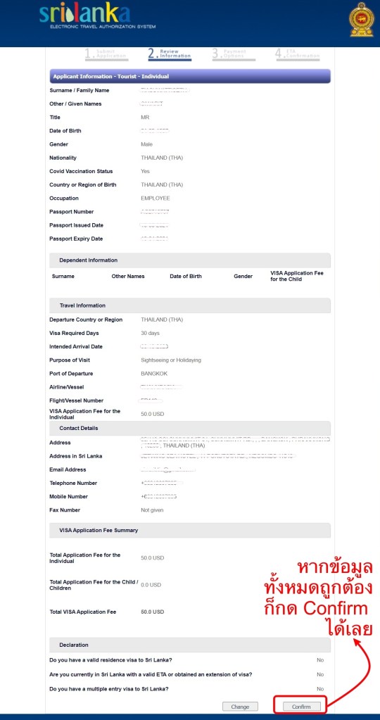 6. ที่หน้านี้ ระบบจะให้เราตรวจสอบข้อมูลทั้งหมดที่กรอกไปอีกครั้ง ขอให้ตรวจสอบให้ละเอียดอีกครั้ง หากมีตรงไหนผิด ให้กด “Change” ที่ด้านล่างเพื่อกลับไปแก้ไข ส่วนถ้าถูกต้องหมดแล้วก็กด “Confirm” เพื่อยืนยันข้อมูลได้เลย