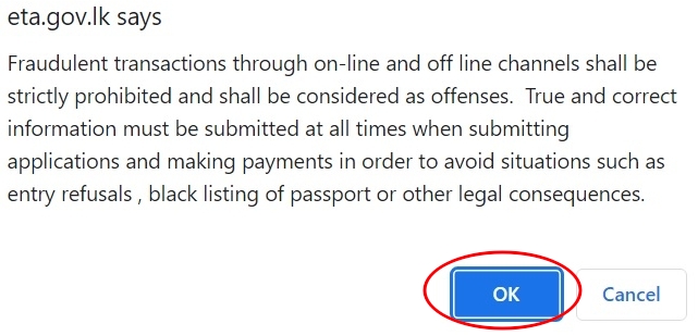 7. จากนั้นจะมี Pop-up เด้งขึ้นมาสองครั้ง เพื่อแจ้งเตือนให้เรายืนยันข้อมูลและบอกเงื่อนไข/กฏเกณฑ์ต่างๆ เกี่ยวกับการให้ข้อมูลวีซ่าอีกครั้ง ให้กด OK ทั้งสองครั้ง ระบบจะพาเราไปขั้นตอนชำระเงิน