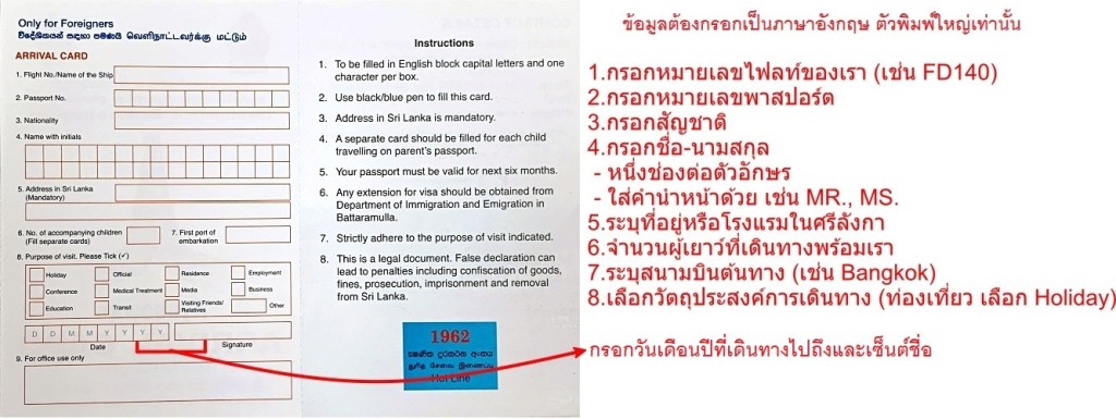 เมื่อลงเครื่องสนามบินที่ศรีลังกาแล้ว ก็เดินไปตามทางเผื่อผ่าน Immigration ได้เลย โดยอย่าลืมมองหาและหยิบใบ Arrival Card เพื่อมากรอกก่อนผ่านเคาน์เตอร์ ตม. ด้วย ไม่เช่นนั้นจะเสียเวลากลับมากรอกและต่อคิวใหม่อีก โดยหน้าตาและการกรอก Arrival Card ก็เป็นดังนี้