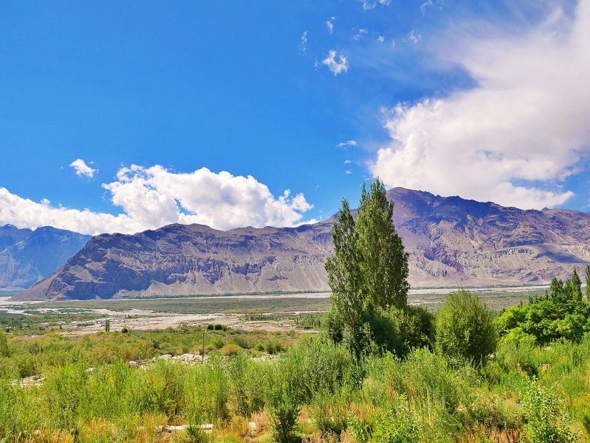 The Sand Dunes is a high-altitude cold desert cut through by a gentle stream, surrounded by vibrant green poplar trees, and set against the backdrop of picturesque, barren mountains. It felt like a unique place where we could witness a desert with snow-capped mountains in the background, a sight we believed to be one-of-a-kind in the world. Furthermore, it resembled both a desert and an oasis in the same location, situated along the banks of the Shyok River. 🏔️