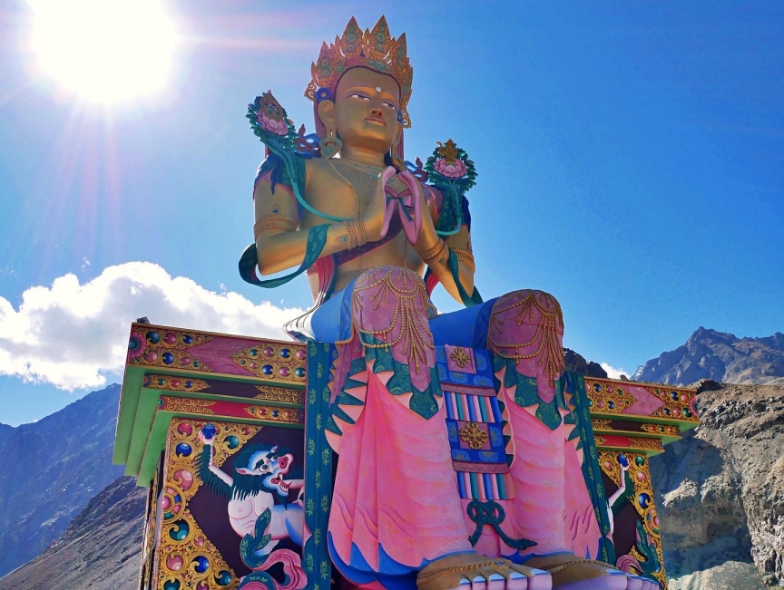 The Diskit Buddha Statue is a 32-meter-tall Maitreya-style Buddha statue, adorned with gold and red features, overlooking the Shyok River. In addition to its aesthetic and spiritual significance, it is thought to represent three key concepts: safeguarding the Diskit Village, advocating world peace, and preventing further conflicts with Pakistan. This Buddha statue stands as a prominent tourist attraction in Nubra Valley.