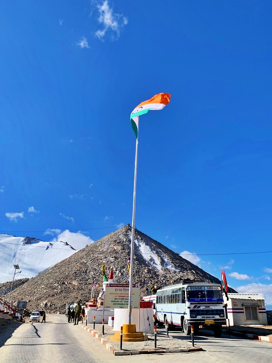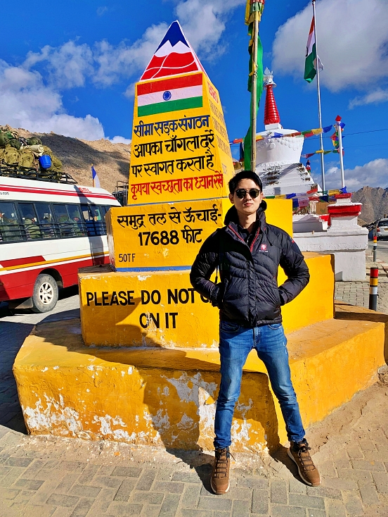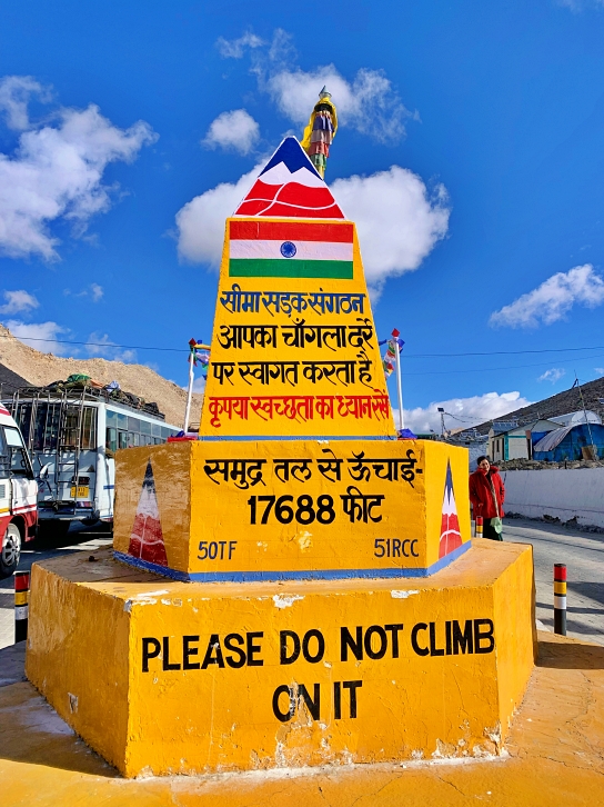 En route, we had to navigate through winding roads and cross over the mountains via the picturesque Pangong Lake Road. Around 9 AM, we reached Chang La Pass, the highest point of this route, standing at 5,400 meters above sea level. We spent 15 minutes here capturing chic and cool photos on the world’s third-highest motorable road.