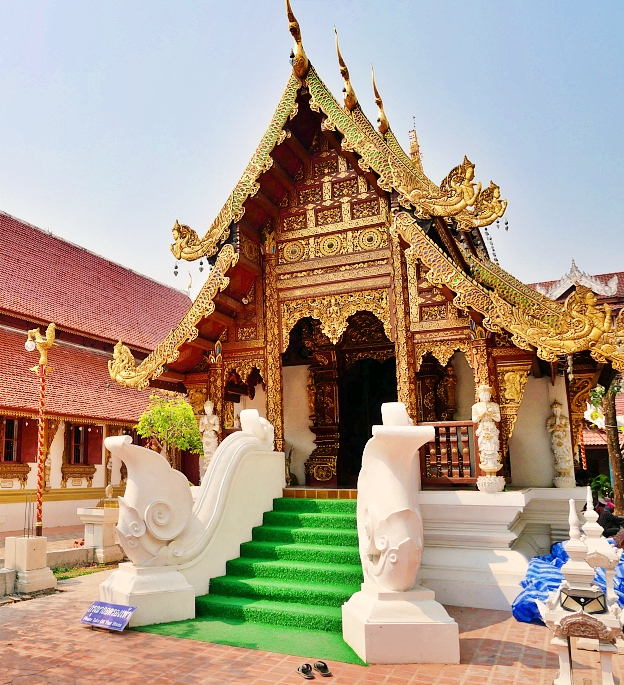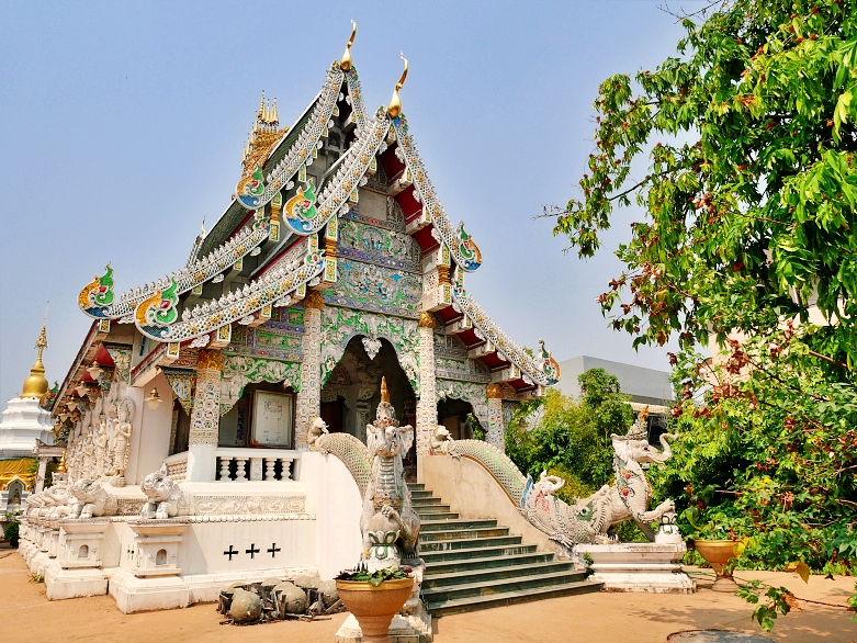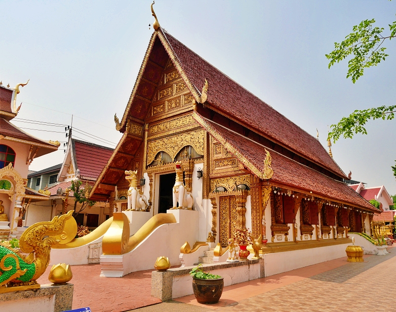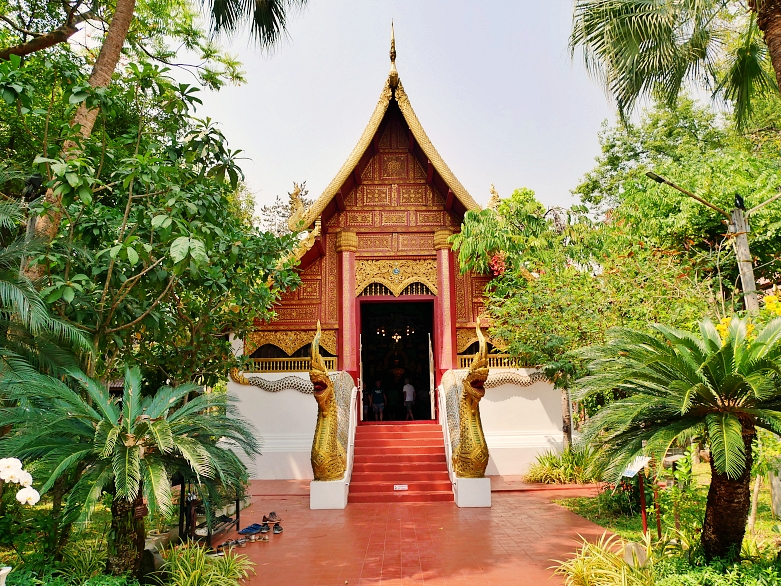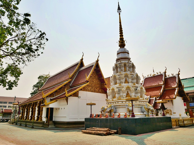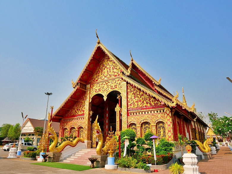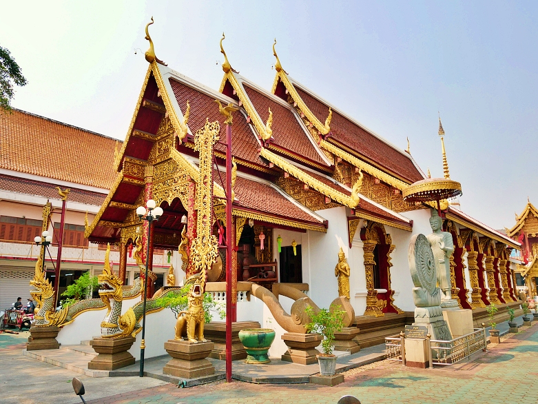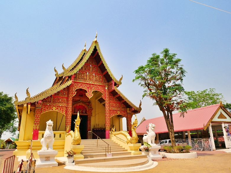 Wat Doi Ngam Mueang was built by King Chaiso ngkram to contain the remains of his father (King Mengrai) in the stupa in 1489. The temple has stairway flanked by Naga serpents. The ordination hall’s facade and entrance door are beautifully decorated with intricate wood carvings depicting Lanna style motifs and Thewada figures. Inside the hall, it has a large Buddha image in the subduing Mara posture on a pedestal surrounded by smaller images. The large pillars are decorated with flower motifs. Wat Doi Ngam Mueang is open daily, 6AM – 5PM with free admission.
