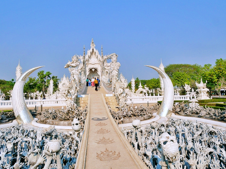 Wat Rong Khun was designed and constructed by Chalermchai Kositpipat, a National Artist, who wished the temple to be like a heavenly paradise, a paradise on earth that humans can touch. The construction was begun in 1997 with Lanna art. It is also known as The White Temple because the main hall and other buildings are painted white and decorated with mirrors. The white symbolizes the purity of the Buddha, and the mirrors symbolize the wisdom of the Buddha that shines throughout the human world and the universe. Nowadays, this temple is the landmark of Chiangrai where the visitor cannot miss. Wat Rong Khun is open daily, 8AM – 5PM. The entrance fee for the foreigner was 100 THB/person (3.25 USD). The visitor can take the photo or video at everywhere in the temple, except inside the ordination hall.
