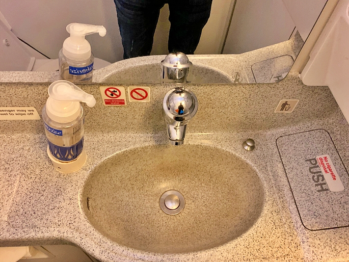 The flight was pushed back and taken-off at 5.25PM. Then, after it was at cruising speed and the seat-belt sign had been switched off, I started to survey the lavatory. It was well cleaned and well equipped with escential things.