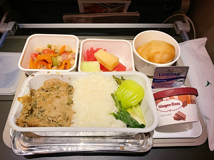About 30 minutes after departure, cabin crew had served the dinner. For economy class, it had 2 choices, Steamed pork with rice or Paneer cheese curry with cumin rice. I selected the first one. Haagen dazs ice-cream and soft drink including tea or coffee had been served to all passengers too. Extremely nice meal service airline !
