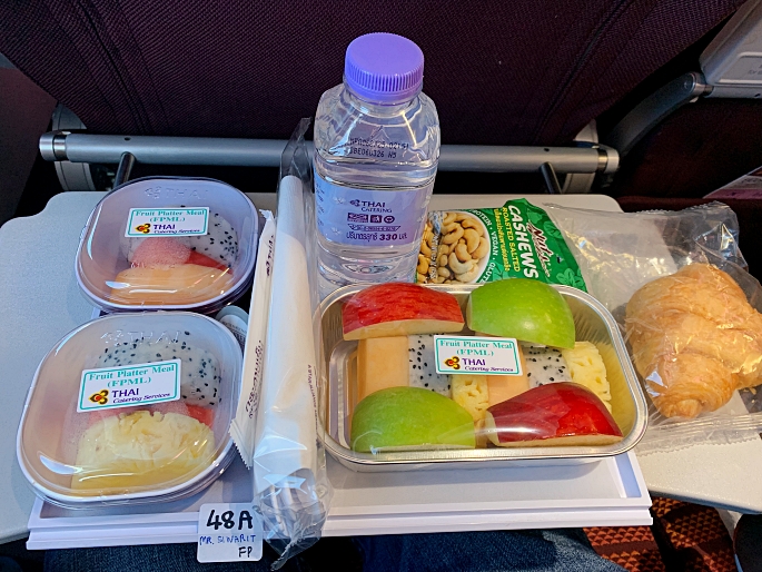 Then, the cabin crews started to serve the in-flight meal. As Thai Airways always serve the food corresponded to the culture of destination and my stomach cannot handle the spiciness of India food. I have ordered special meal, Fruit Platter in advance. The soft drink (and hard drink) were served along with the meal. I select hot tea to sip during the flight.