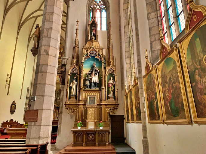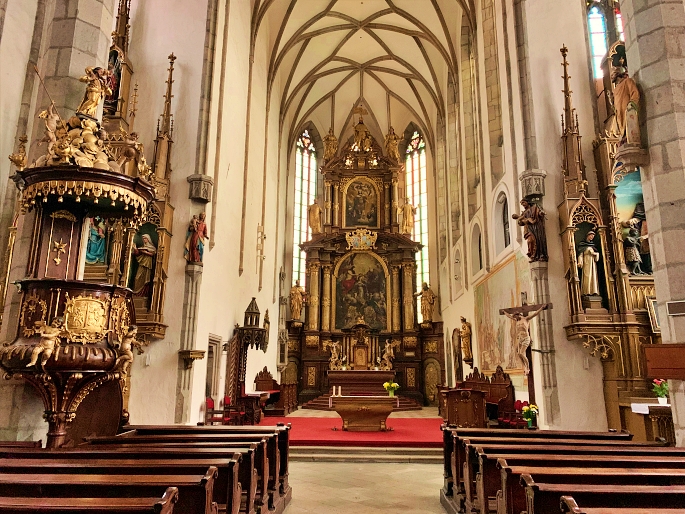 The Church of St. Vitus is an important landmark in Český Krumlov, built mainly in the 1400s as the town grew in wealth and influence. Standing near the river, its tall Gothic shape and pointed tower add drama to the town skyline. Outside, the stone walls and narrow windows give it a strong medieval look. Inside, the church feels calm and spacious, with high arches, old wooden benches, and beautiful stained glass that colors the light. Visitors can also see historic altars and paintings, offering a quiet moment away from the busy streets. The Church of St. Vitus open daily with free entry, 9AM – 4.30PM (Sunday is open on 11AM).